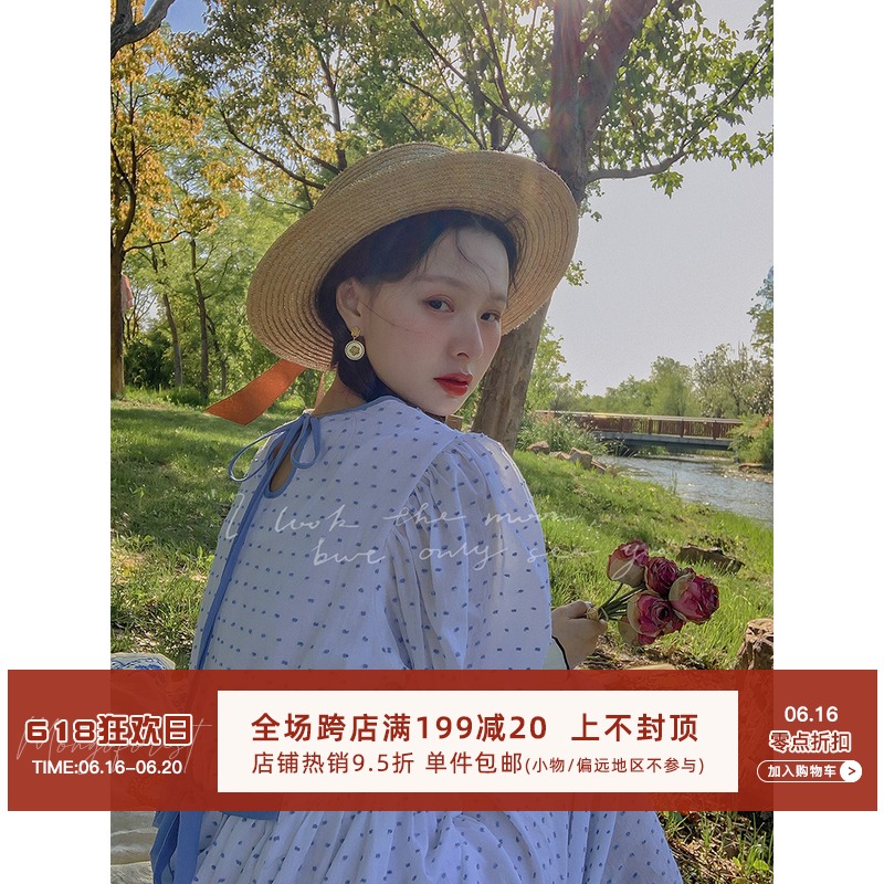 萌果森林原创/星岛/清新的蓝设计感包边植绒波点撞色短袖连衣裙女热门设计联盟服务商